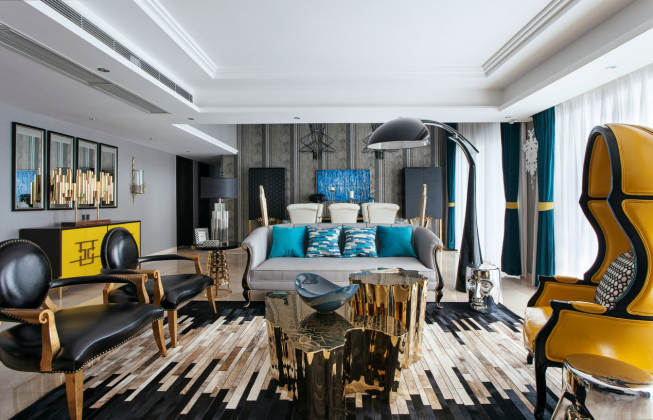 公共空间以开放式的格局表现出奢华与大气,拼花地板与象牙白墙装饰巧妙地融合在一起、暖褐色基调像是整个纯白色空间流淌的白色巧克力,温润有质感。大体量的rochebobis沙发舒适有质感,与怪趣张扬的moooi单椅,和大理石质感面料的单人位沙发从未如此和谐。几何质感的布艺运用更是让整个空间丰富起来。不得不提的是墙面的挂盘装饰,FORNASETTI,这个被设计界津津乐道的灵感缪斯,天使般的脸庞,黑、白、金色的完美运用,使墙面装饰规整而有灵性,又能在潜移默化中把空间里的各个元素材质及色彩巧妙的融合在一起,画龙点睛