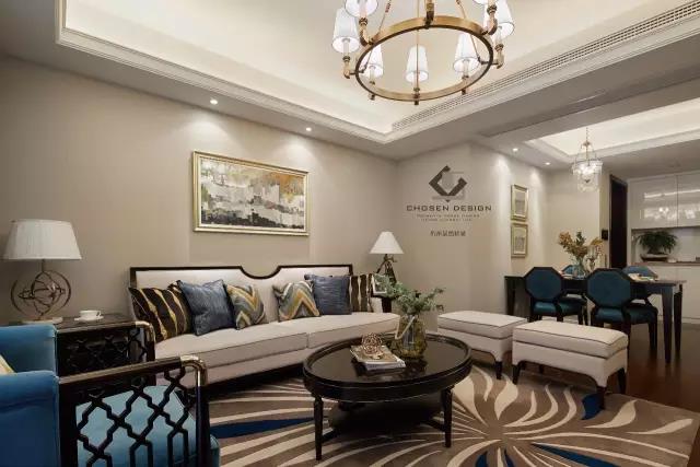 湛蓝与白色相互缠绕,营造出纯洁干净的视觉感受;灰蓝色的地毯犹如大海,创造出了开阔的视觉空间。简洁的主体家具搭配奢华的石材背景,时尚在前,古典在后。