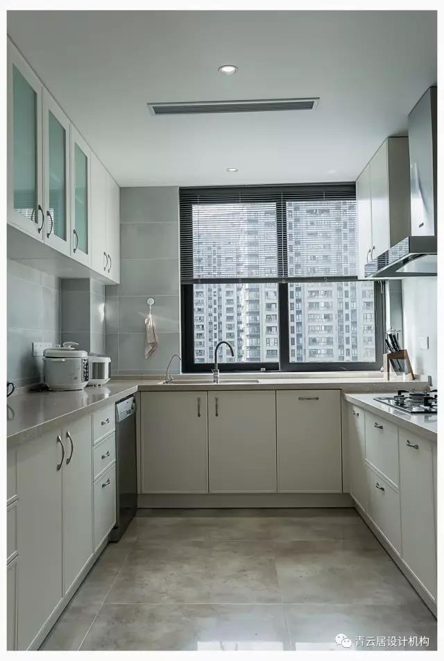 设计师在空间中采用了米白色做为主色调,墙面铺贴灰色瓷砖。隔断打掉,厨房使用面积大大增加,客厅同样的地砖依然出现,操作台面与之颜色相呼应。合理设计的地柜与吊柜增加了存放空间。