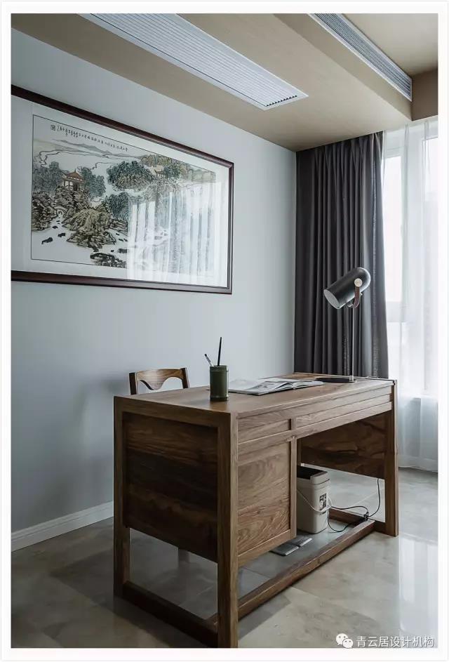 简洁、干净的书房在家具配置上,书桌独特的纹理格外有感觉,灰色墙面和木质吊顶使空间倍感舒适,墙面简单挂一副山水字画,沉稳与大气并存。